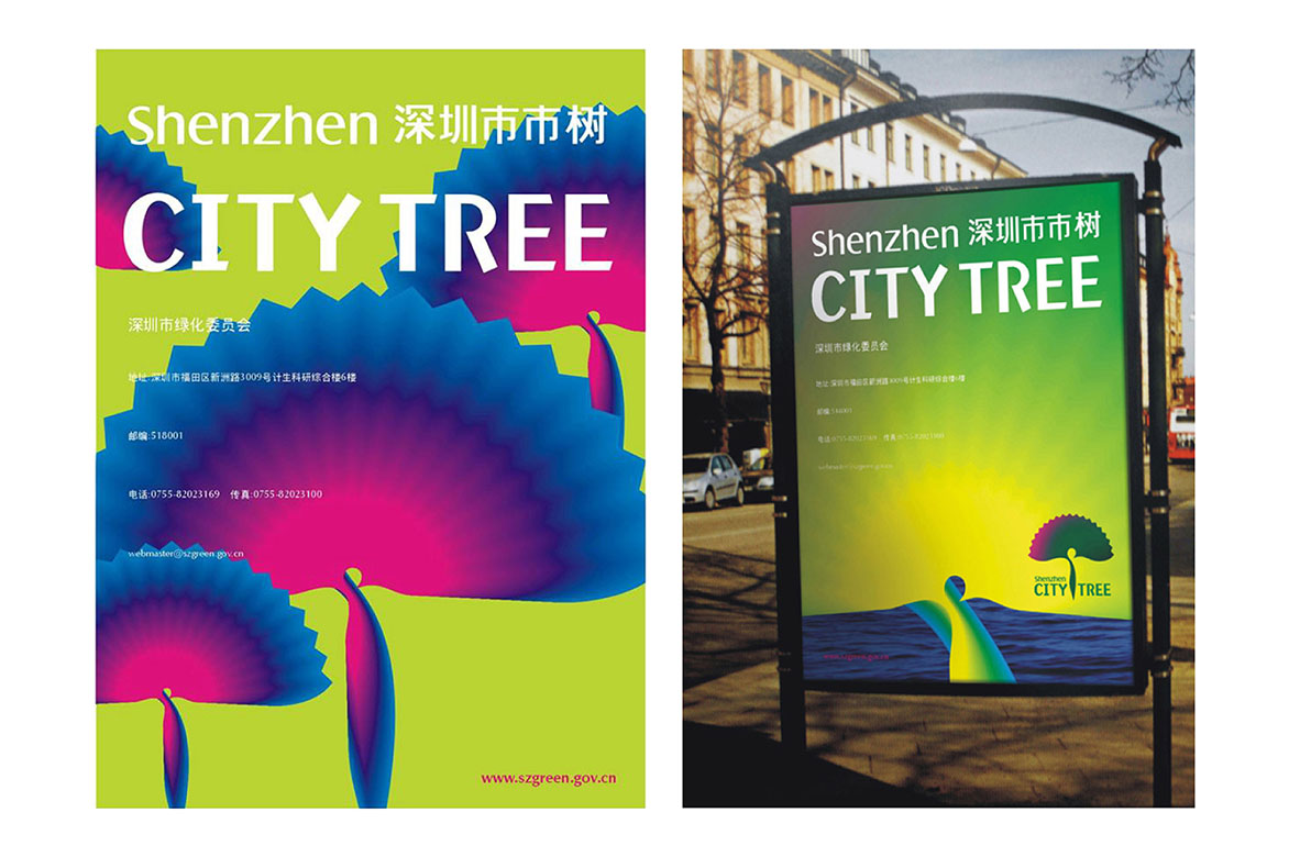 2007年7月,深圳市四届人大常委会第十三次会议审议通过在保留荔枝树作为市树的基础上,增选红树为我市第二市树。市树从荔枝树到红树,契合了从速度深圳向生态深圳的转变,反映了深圳城市文化与内涵的提升,具有与时俱进的导向性作用,同时体现了人与自然的和谐统一。在项目开展前,深圳市绿化委员并未从征集到满意的设计方案。因此深圳市绿委会直接委托陈绍华设计公司来完成此项目,标志需要体现出这两种市树所蕴含的生态文明建设和家园意识的理念,凸显深圳精神,提炼深圳形象,准确把握深圳城市文化内涵、定位和发展脉搏,且最终由平面设计、雕塑、艺术等方面专家进行评审。该标识上半部分图形取自荔枝果实的外表面结构,下部分图形为红树的本质特征——胎生的胎苗,将二者巧妙结合融入之上阐述设计理念,塑造出一个简洁优美,大气、国际化、深圳特有的市树形象标识。准确巧妙的诠释出深圳市市树(荔枝+红树)的特质所承载的城市精神诉求:生态深圳,和谐深圳。更具象的表达「深圳城市生态保护伞」的概念,展现人与自然和谐共生的环境。